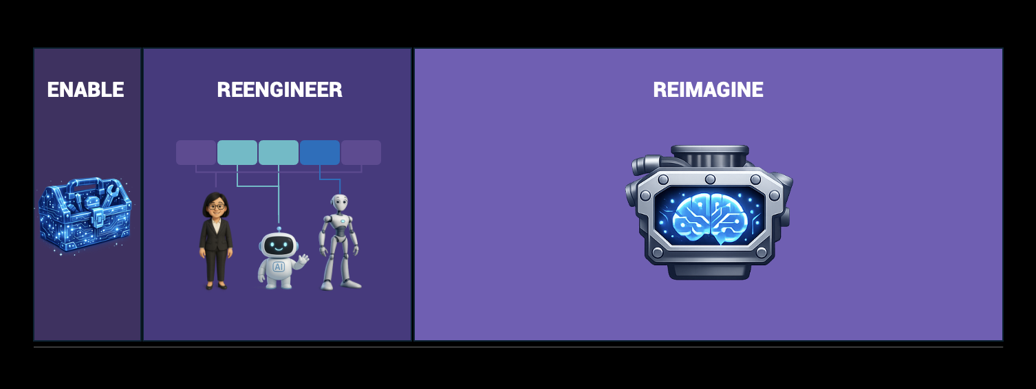 It’s the difference between adding electricity to a factory and redesigning the factory around electric power. The first improves efficiency. The second reinvents production.