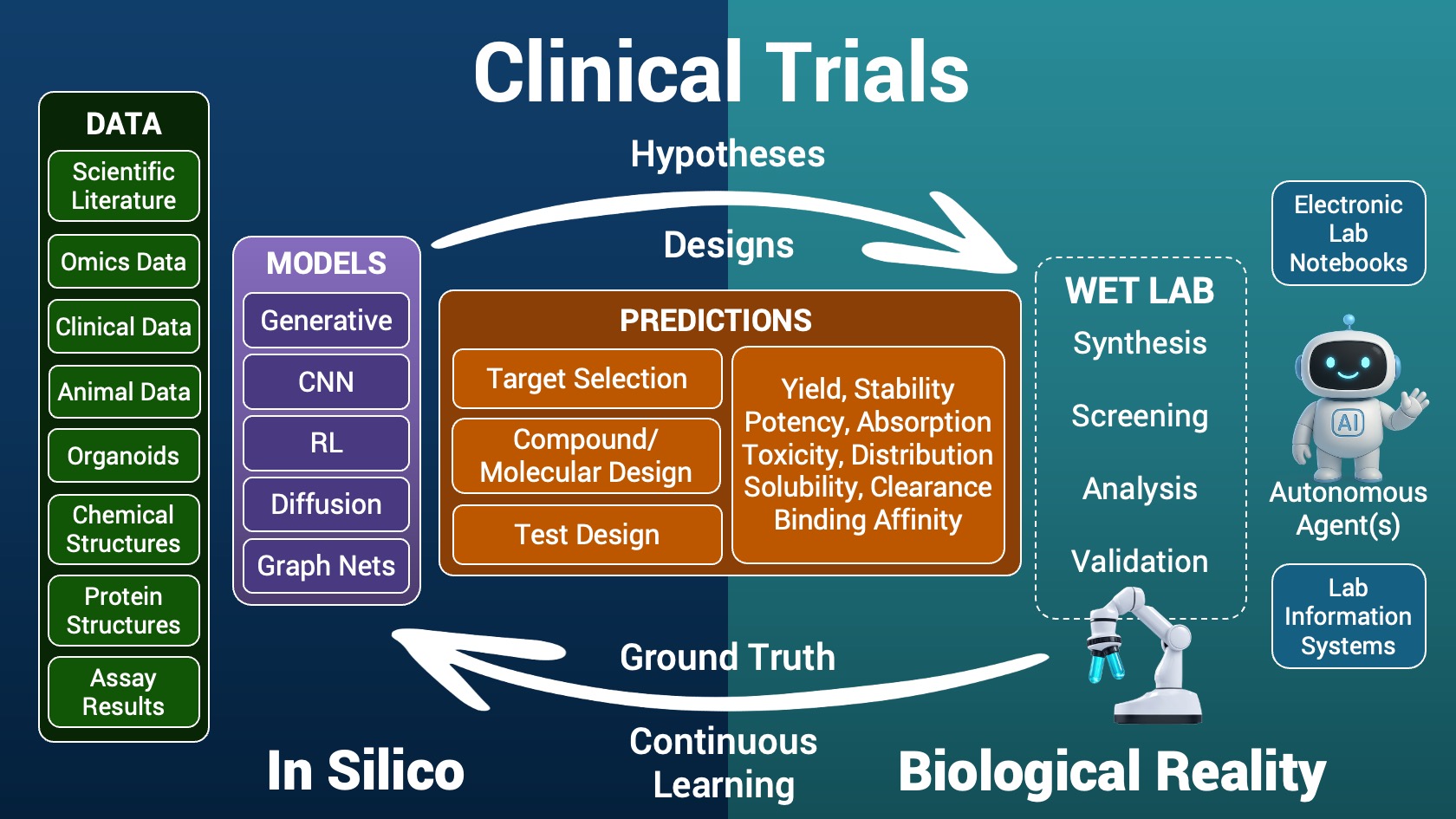 In most scenarios, when building a vision for an AI-first approach, it’s helpful to consider operations spanning both the digital and physical domains. Drug discovery is mostly digital, while validation of biological reality occurs firmly in the physical world, inside wet labs.